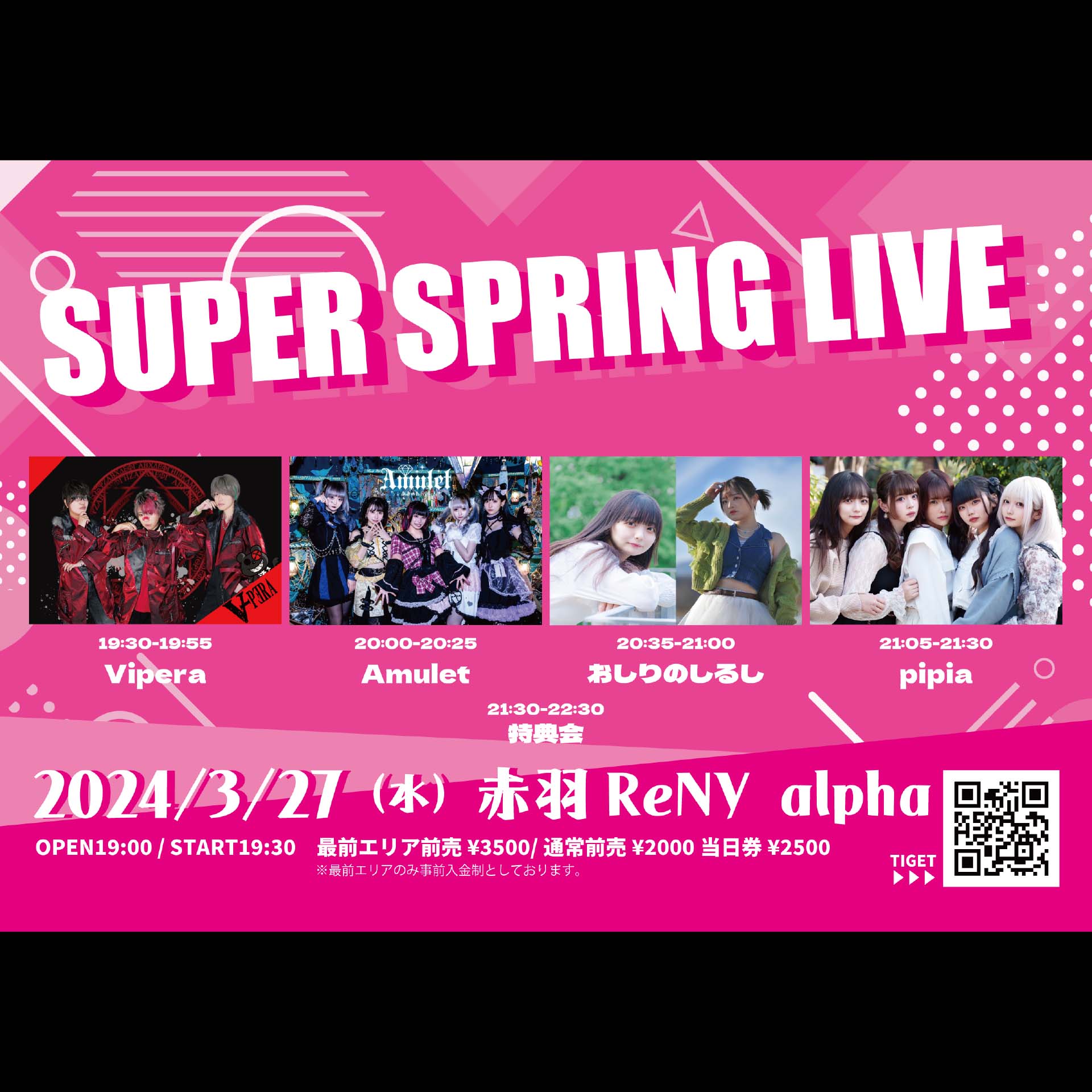最前エリア¥3,500 / ¥4,000 (D代別途要)通常エリア¥2,000 / ¥2,500 (D代別途要)