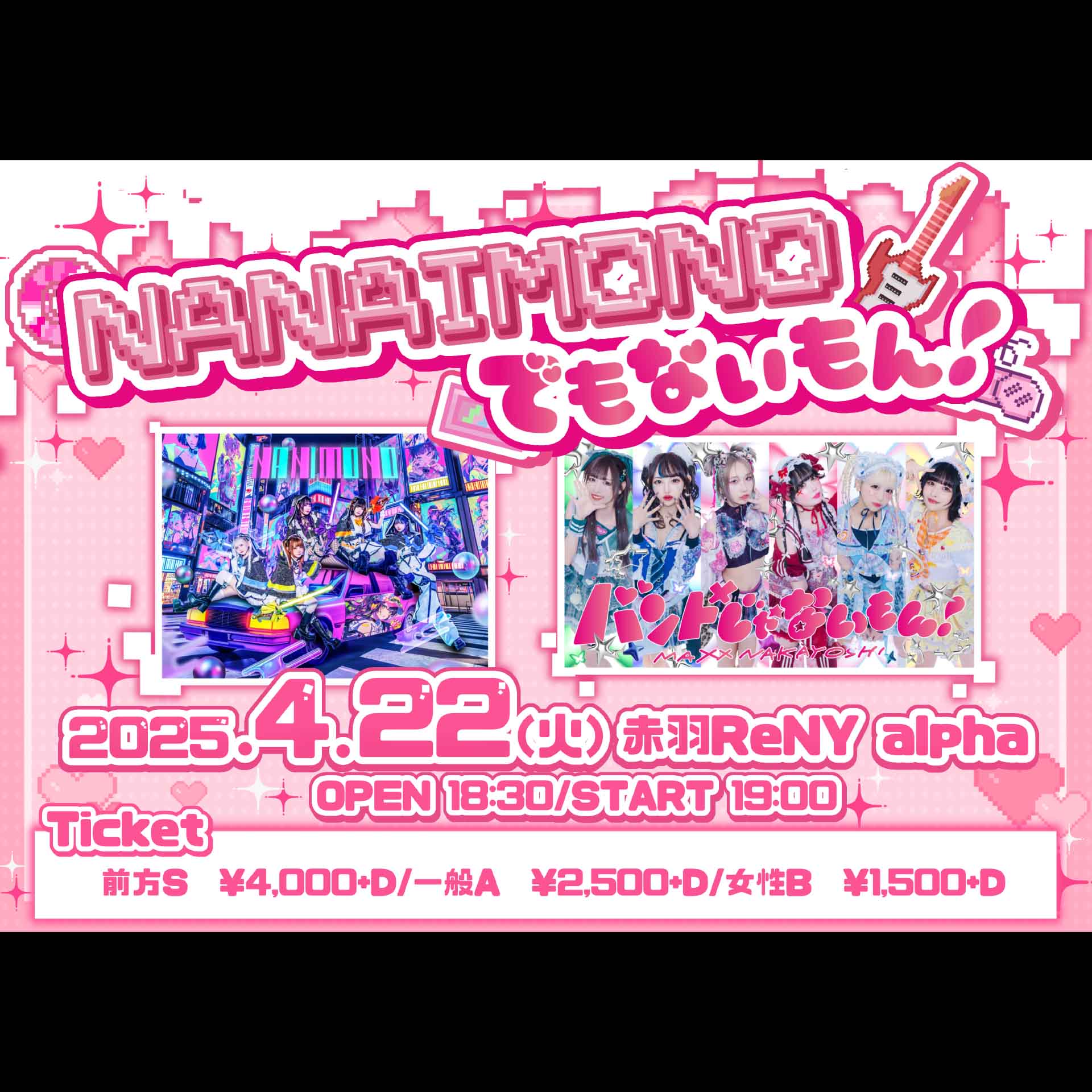 前方S¥4,000 / ¥-,― (D代別途要)一般A¥2,500 / ¥-,― (D代別途要)女性B¥1,500 / ¥-,― (D代別途要)【入場順】S1~→A1~ → B1~→ 当日券
