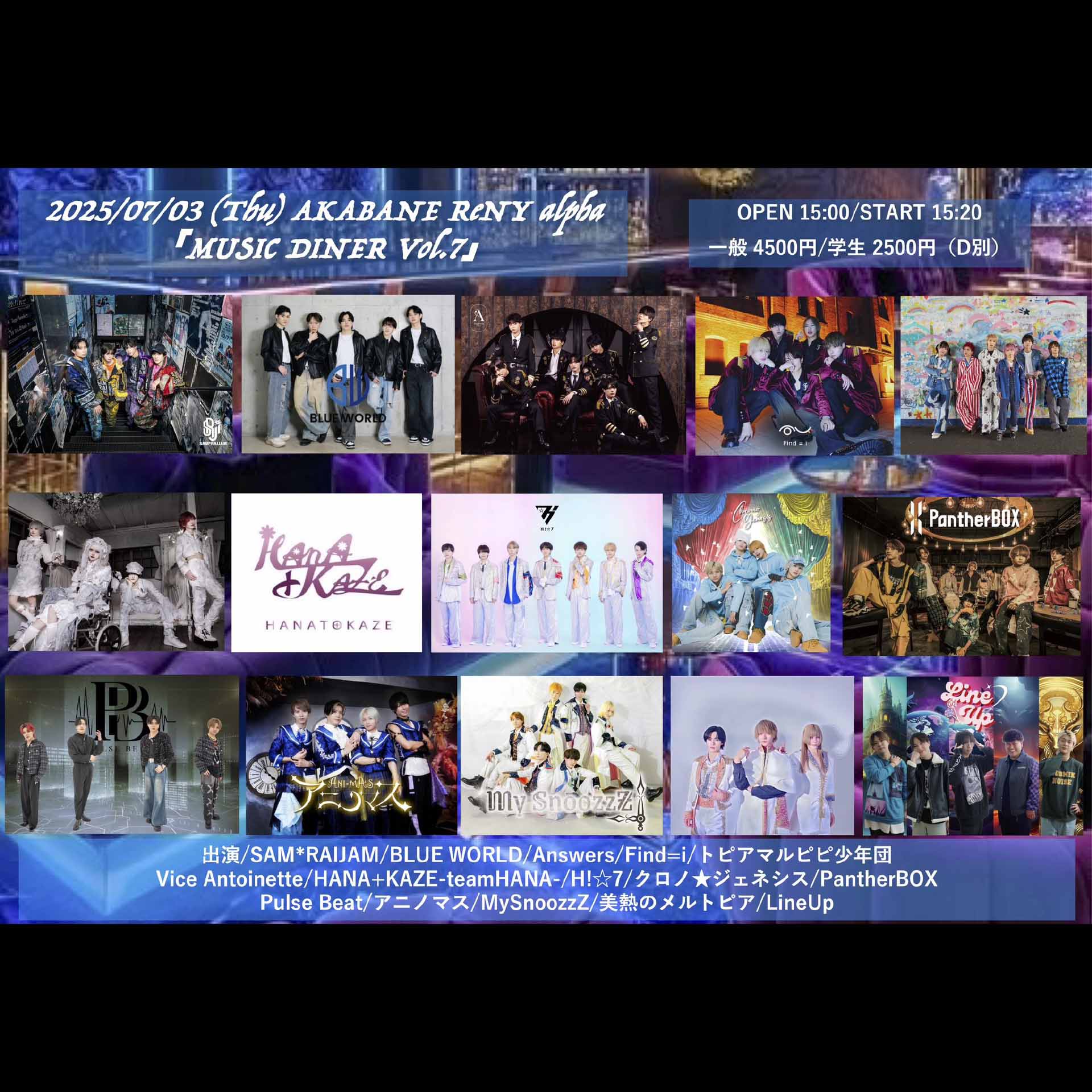 SAM*RAIJAM/BLUE WORLD/Answers/Find=i/トピアマルピピ少年団/Vice Antoinette/HANA+KAZE-teamHANA-/H!☆7/クロノ★ジェネシス/PantherBOX/Pulse Beat/アニノマス/MySnoozzZ/美熱のメルトピア/LineUp