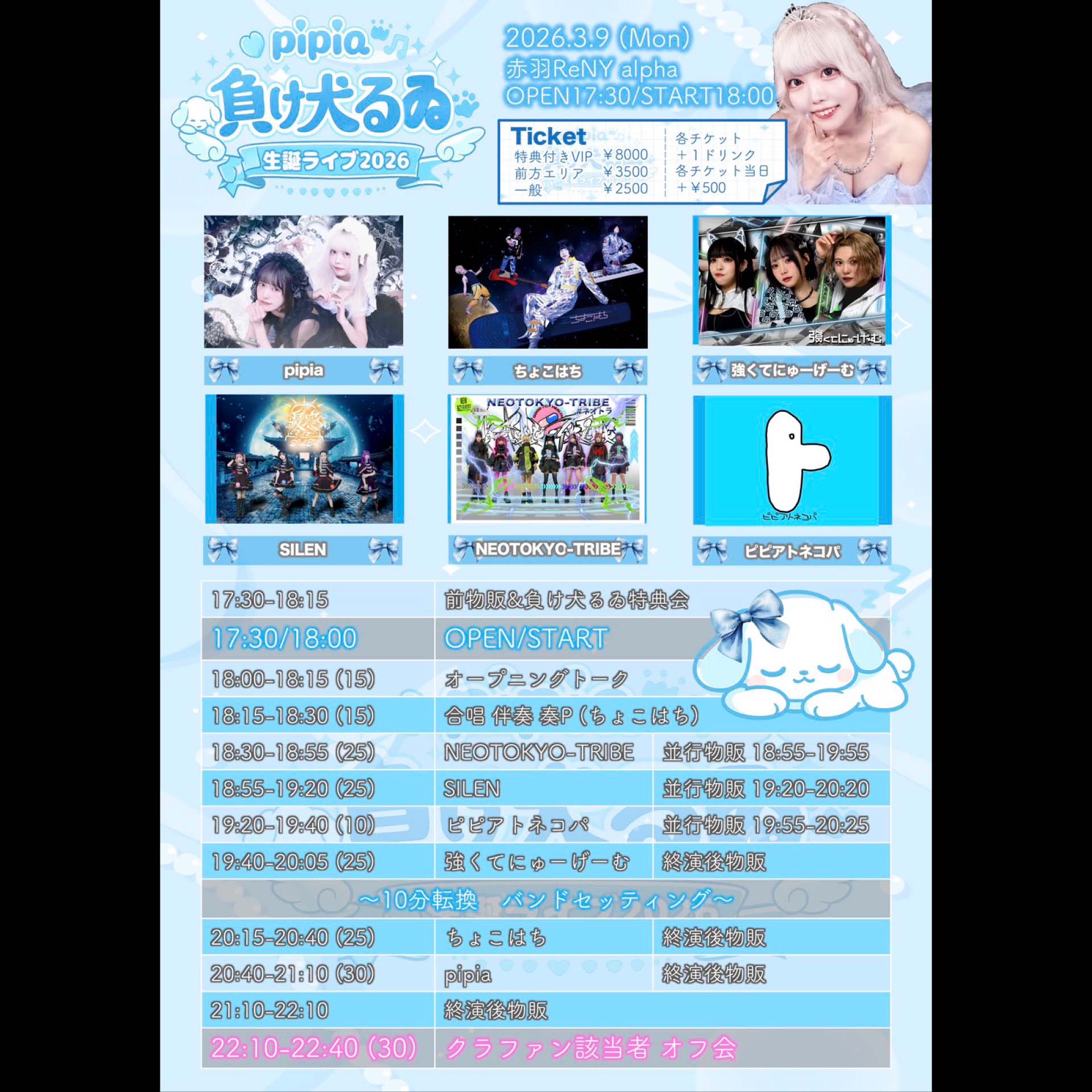 特典付きVIP¥8,000 / ¥-,― (D代別途要)最前エリア¥3,500 / ¥-,― (D代別途要)一般¥2,500 / ¥3,000 (D代別途要)