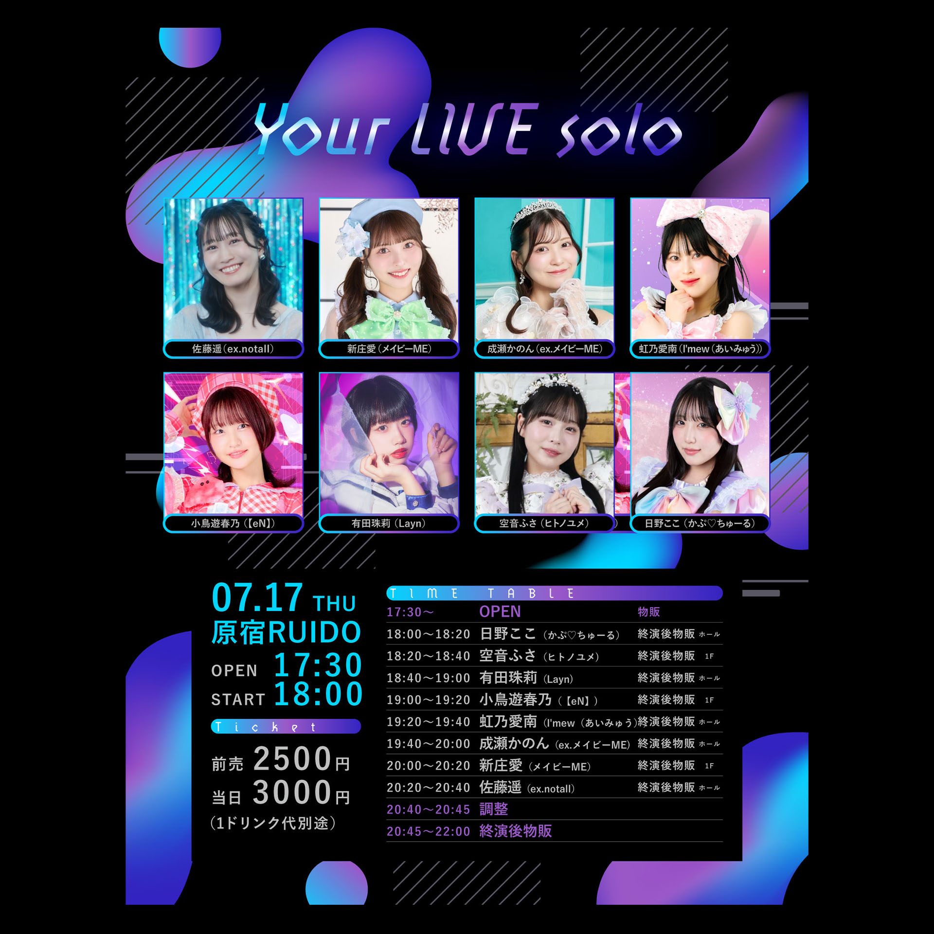 佐藤遥(ex.notall) / 新庄愛(メイビーME) / 成瀬かのん(ex.メイビーME) / 虹乃愛南(I'mew(あいみゅう)) / 小鳥遊春乃(【eN】) / 有田珠莉(Layn) / 空音ふさ(ヒトノユメ) / 日野ここ(かぷ♡ちゅーる)