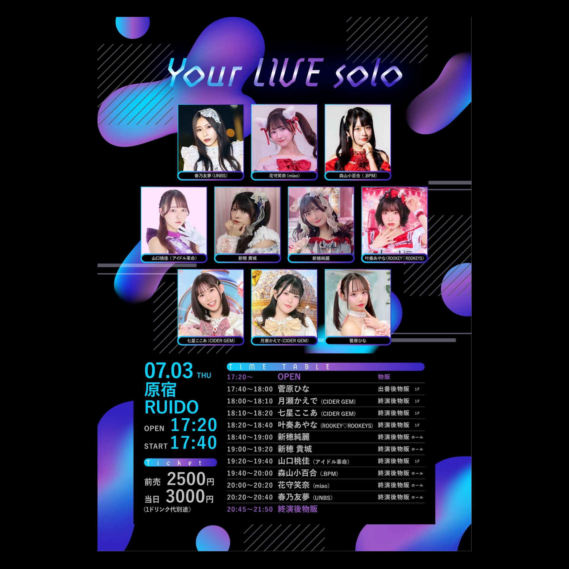 春乃友夢(UNBS)/花守笑奈(miao)/森山小百合(.BPM)/山口桃佳(アイドル革命)/新穂 貴城/新穂純麗/叶奏あやな(ROOKEY♡ROOKEYS)/七星ここあ、月瀬かえで(CIDER GEM)/菅原ひな
