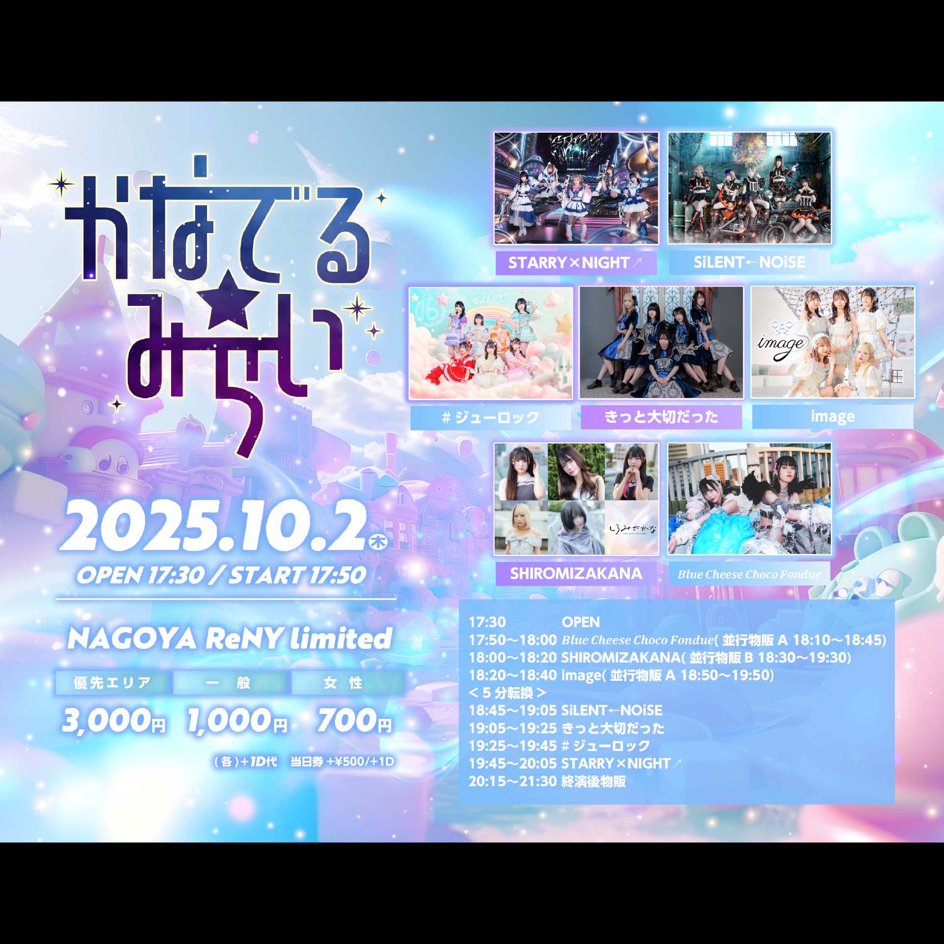 一般チケット¥1,000 / ¥1,500 (D代別途要)優先エリアチケット¥3,000 / ¥3,500 (D代別途要)女性チケット¥700 / ¥1,200 (D代別途要)