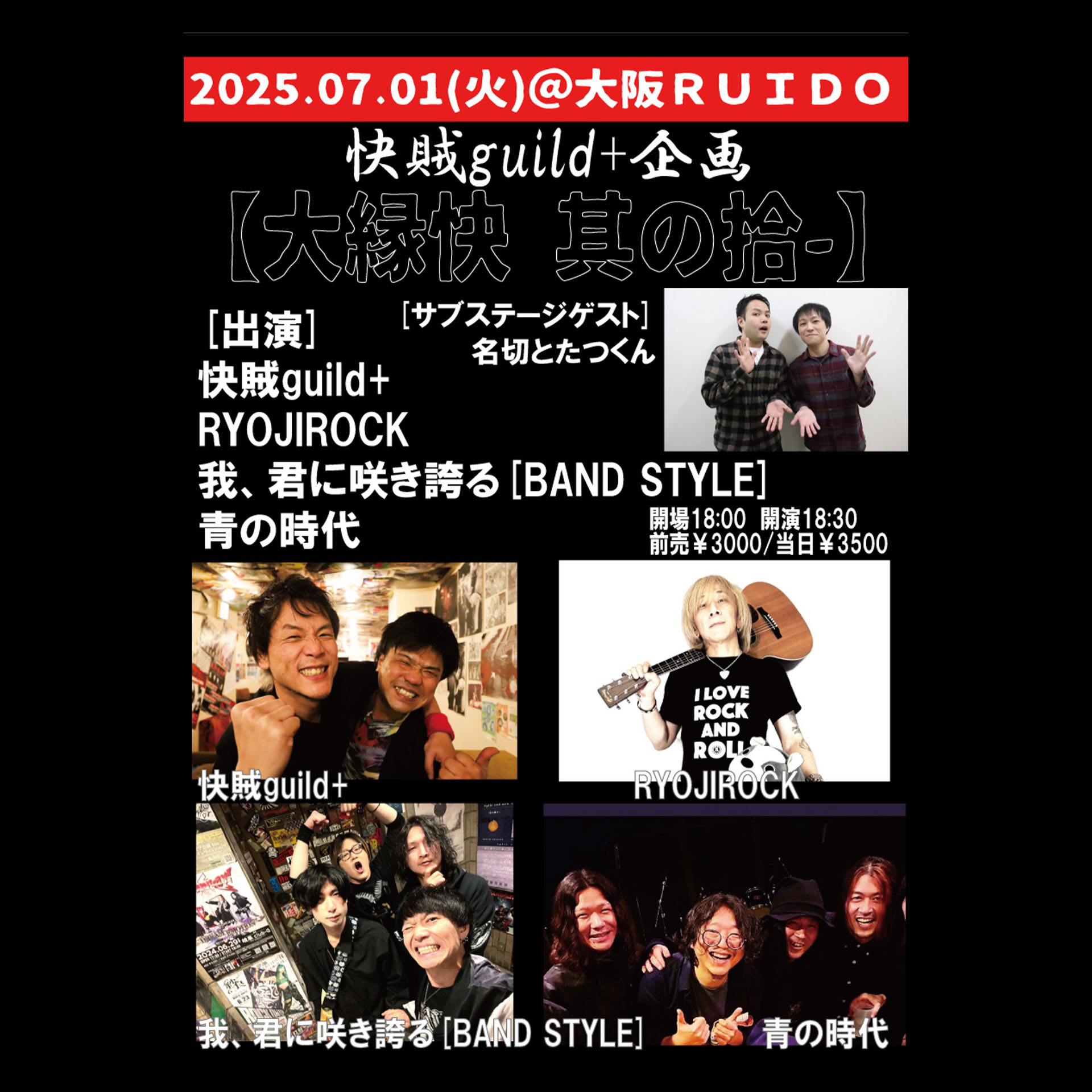 快賊guild+/RYOJIROCK/我、君に咲き誇る[BAND STYLE]/青の時代 ※傷女融解の出演はキャンセルとなりました。 [サブステージゲスト] 名切とたつくん