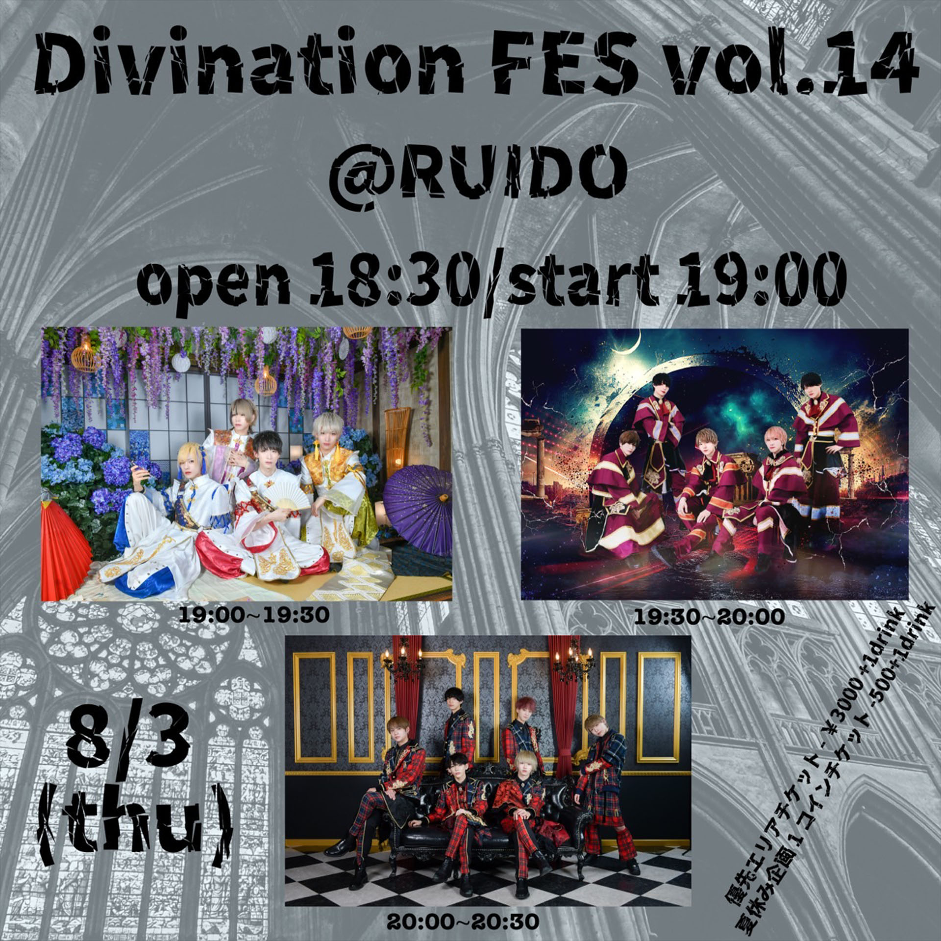[優先エリアチケット]¥3,000 (D代別途要) ■https://t.livepocket.jp/e/zwpgf[夏休み企画 1コインチケット]¥500 (D代別途要) ■https://t.livepocket.jp/e/ejf88