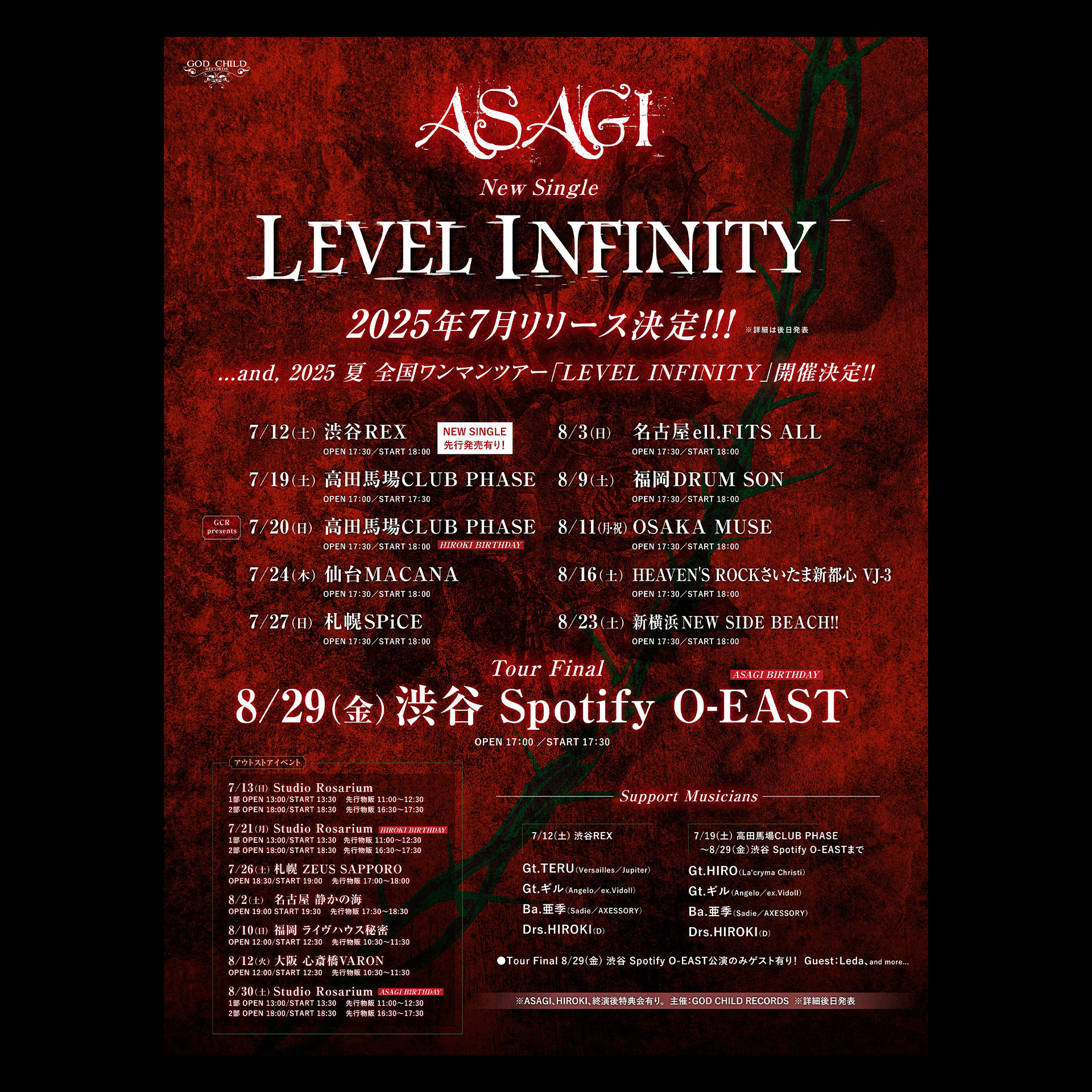 ASAGI < Support Musicians > Gt.TERU(Versailles / Jupiter) Gt.ギル(Angelo/ex.Vidoll) Ba.亜季(Sadie/AXESSORY) Drs.HIROKI(D)