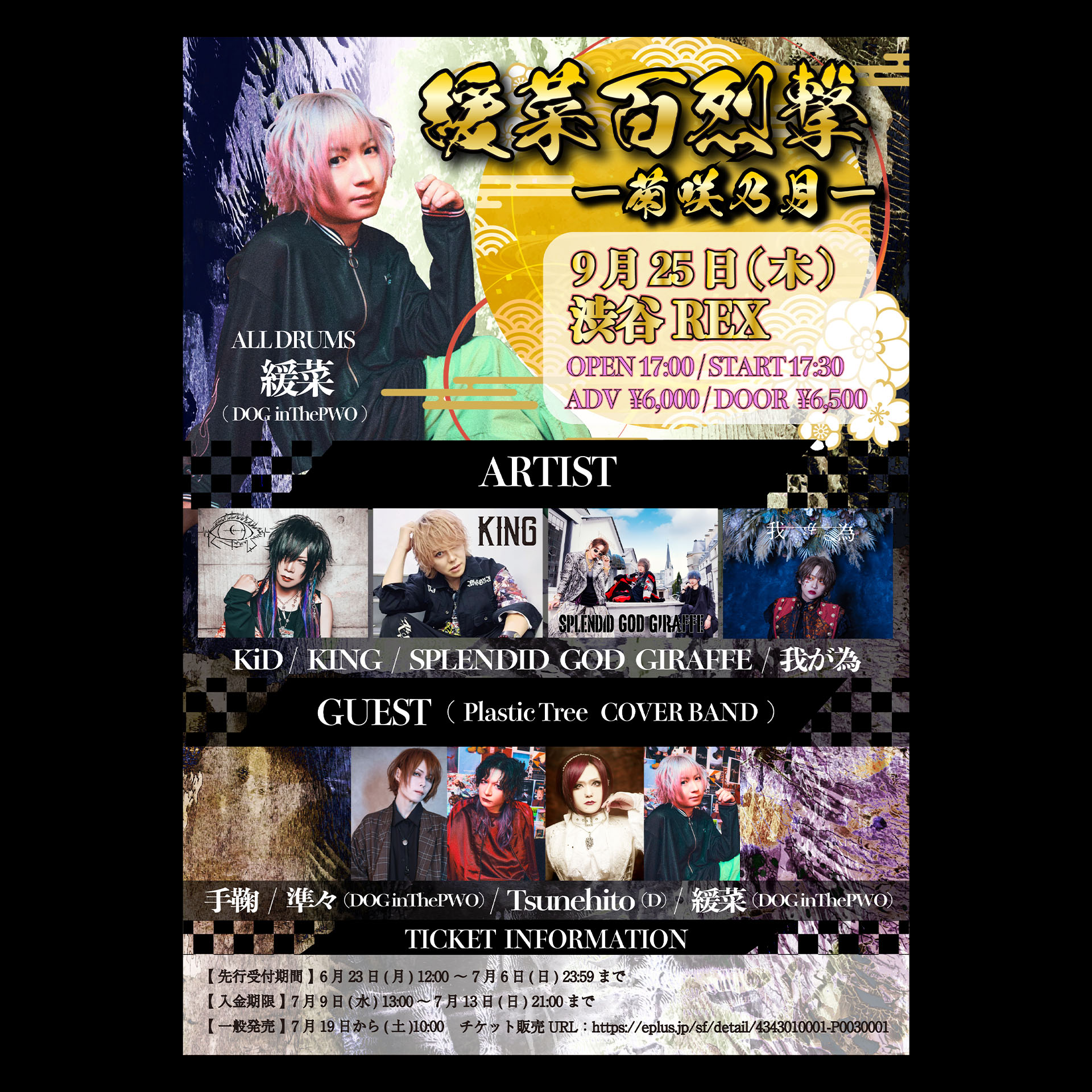 ◎ALL DRUMS : 緩菜◎ARTIST:KiD / KING / SPLENDID GOD GIRAFFE / 我が為◎GUEST:Plastic Tree COVER BAND [手鞠 / 準々 (DOG inThePWO) / Tsunehito (D) / 緩菜 (DOG inThePWO)]