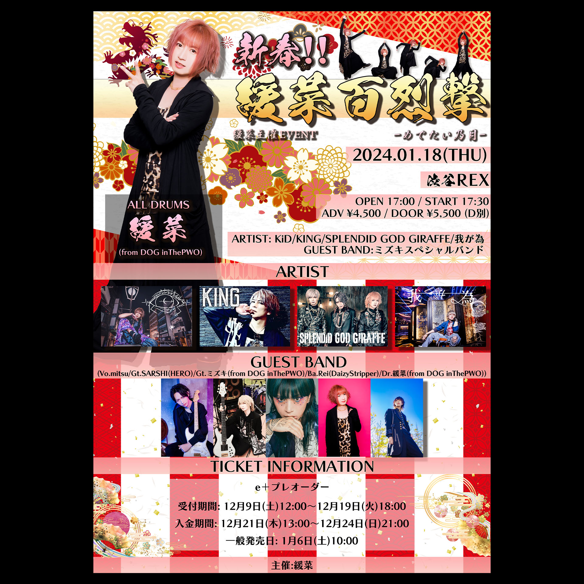 ALL DRUMS : 緩菜KiD/KING/SPLENDID GOD GIRAFFE/我が為GUEST : 『ミズキスペシャルバンド』(Vo.mitsu / Gt.SARSHI(HERO) / Gt.ミズキ(from DOG inThePWO) / Ba.Rei(DaizyStripper) / Dr.緩菜(from DOG inThePWO))