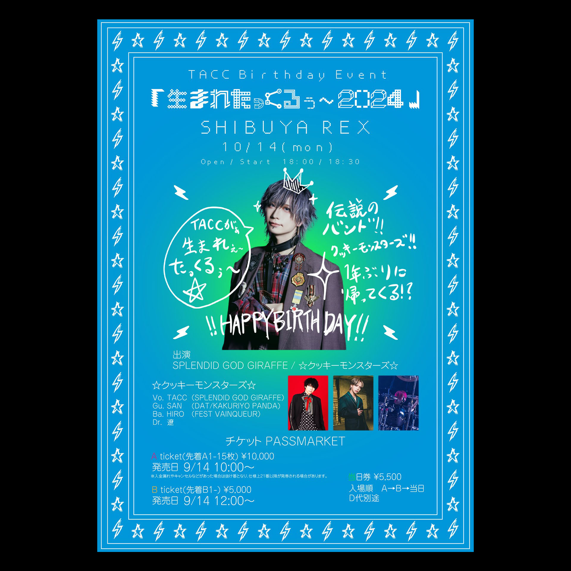 SPLENDID GOD GIRAFFE☆クッキーモンスターズ☆Vo.TACC(SPLENDID GOD GIRAFFE)Gu.SAN(DAT/KAKURIYO PANDA)Ba.HIRO(FEST VAINQUEUR)Dr.遼