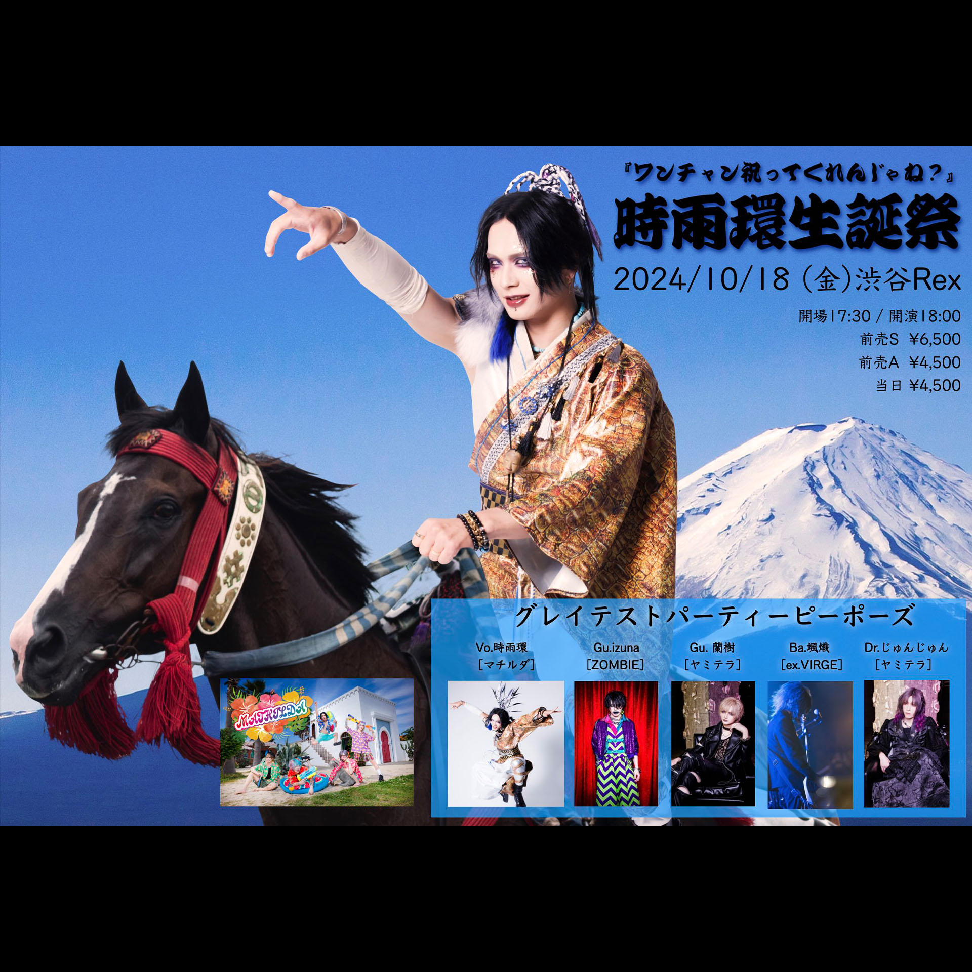 マチルダグレイテストパーティーピーポーズVo.時雨環[マチルダ]/ Gu.izuna[ZOMBIE]/ Gu. 蘭樹[ヤミテラ]/ Ba.颯熾[ex.VIRGE]/ Dr.じゅんじゅん[ヤミテラ]