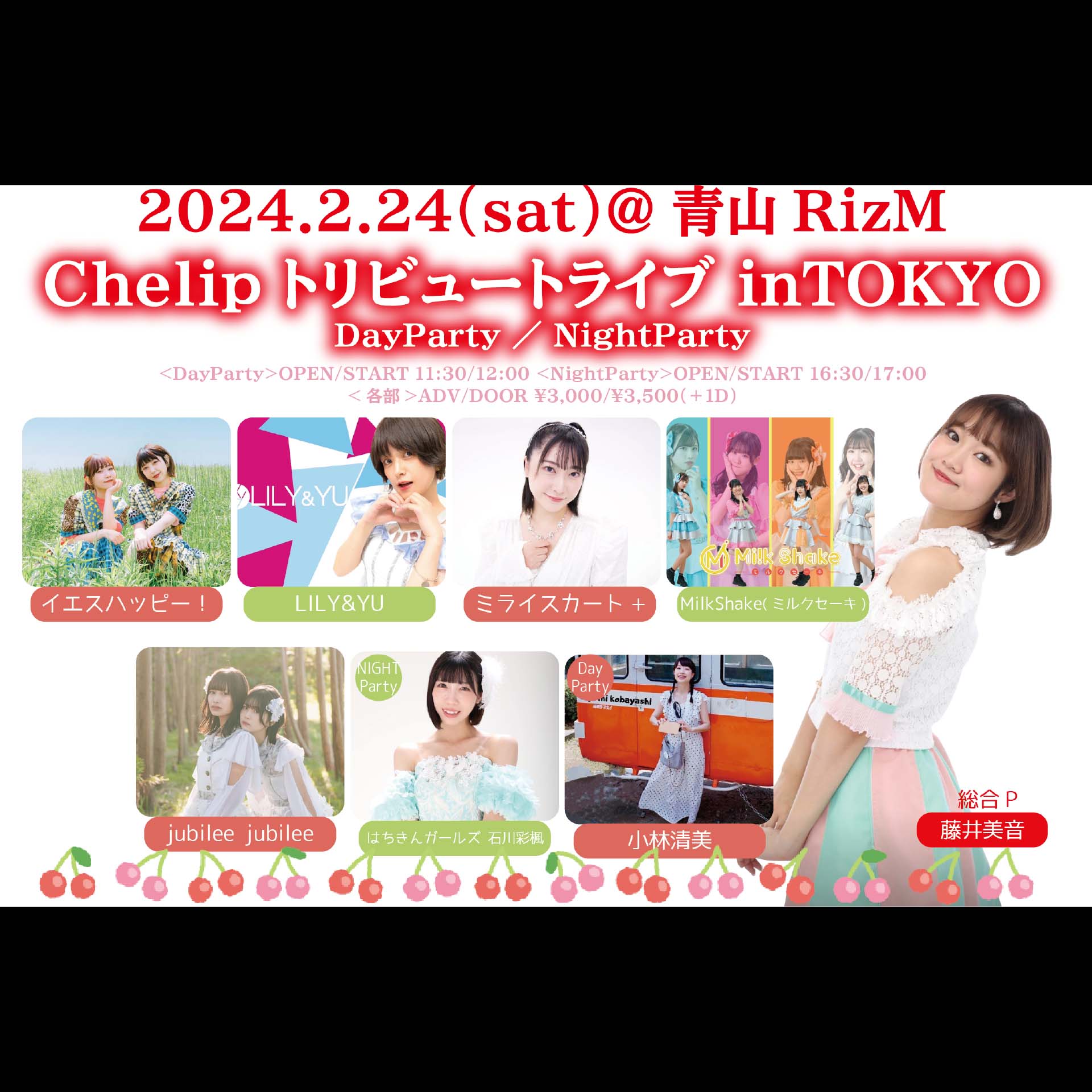 イエスハッピー!/ミライスカート+/LILY&YU/MilkShake(ミルクセーキ)/jubilee jubilee/小林清美(DayPartyのみ)/はちきんガールズ 石川彩楓(NightPartyのみ)/総合P 藤井美音