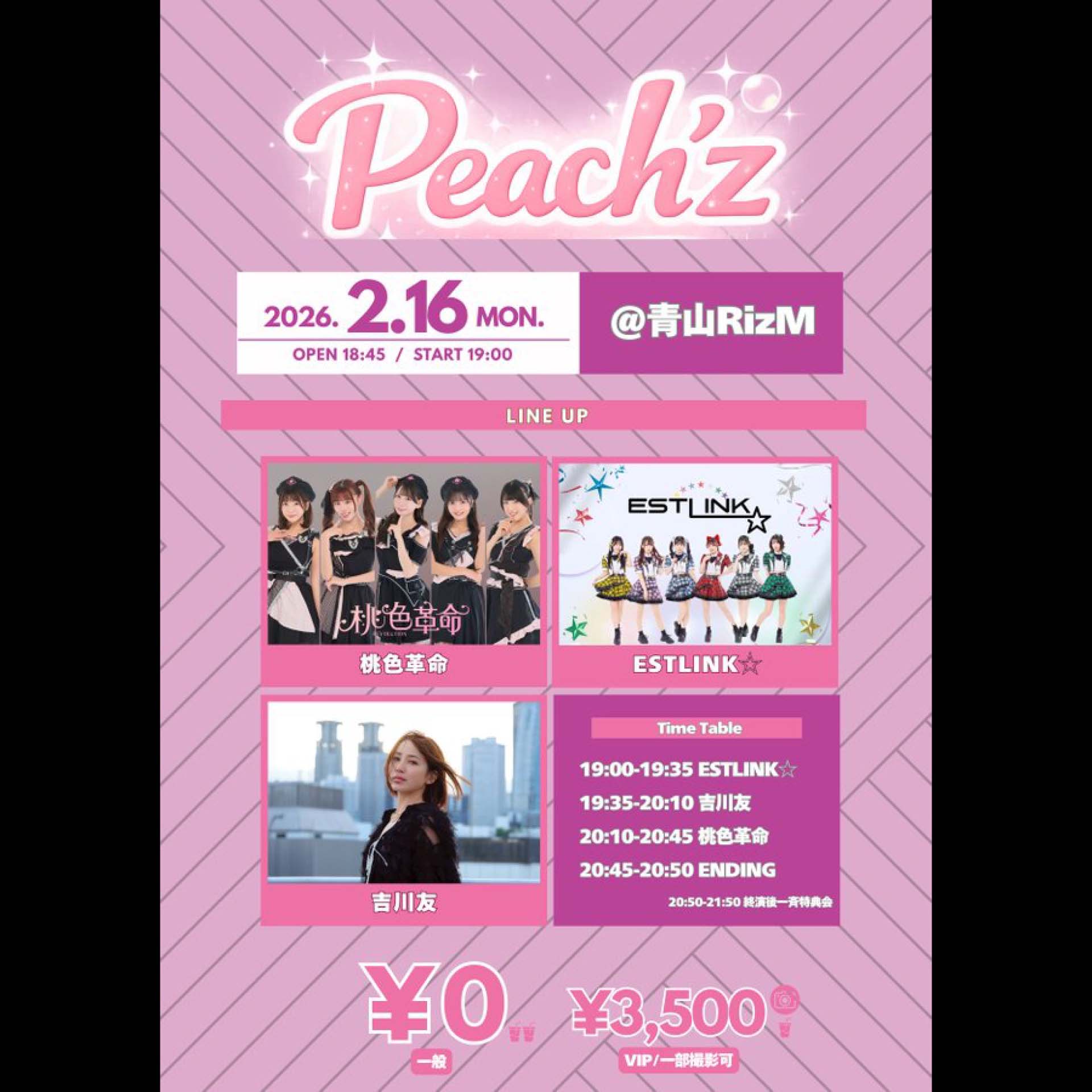 VIP¥3,500(1D別途) / 一般¥0 (2D代別途)